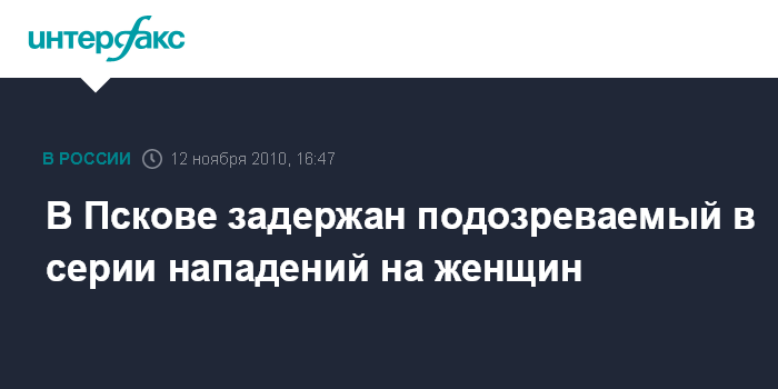 Псков. 12 ноября. INTERFAX.RU - В Пскове задержан подозреваемый в совершении серии изнасилований и убийств женщин в сентябре-октябре текущего года.