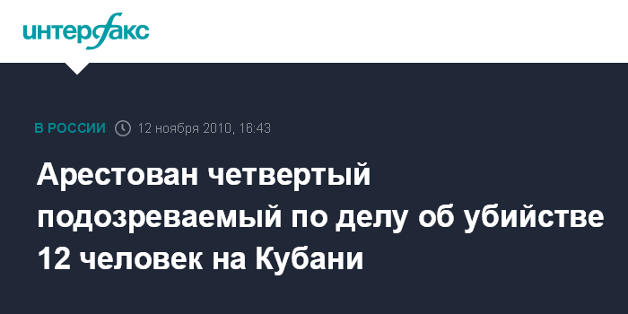 Москва. 12 ноября. INTDRFAX.RU - Суд арестовал четвертого подозреваемого в убийстве 12 человек в станице Кущевская Краснодарского края.