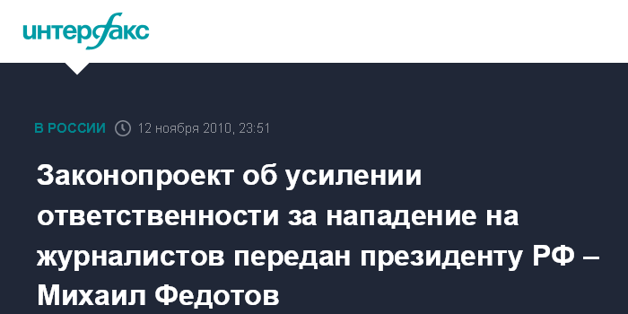 Москва. 12 ноября. ИНТЕРФАКС - Поправки в законодательство, ужесточающие ответственность за нападение на журналистов, подготовлены и переданы президенту РФ Дмитрию Медведеву, сообщил глава Совета при президенте России по развитию институтов гражданского общества и правам человека Михаил Федотов.