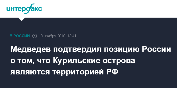 Иокогама. 13 ноября. INTERFAX.RU - Президент РФ Дмитрий Медведев на встрече с премьер-министром Японии Наото Каном вновь подтвердил позицию России о том, что Курильские острова являются российской территорией, и пригласил премьер-министра Японии посетить Россию, в том числе Дальний Восток. Об этом журналистам сообщил по окончании встречи глава МИД РФ Сергей Лавров.