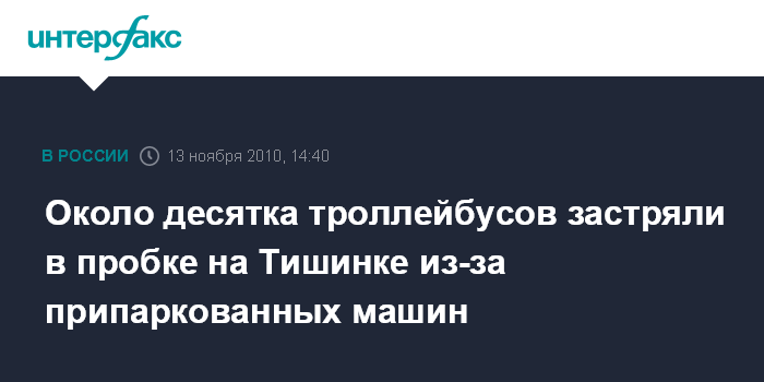 13 ноября. ИНТЕРФАКС - На Тишинской площади столицы семь троллейбусов стоят друг за другом из-за того, что проезжая часть перегорожена припаркованными машинами, передает корреспондент "Интерфакса".
