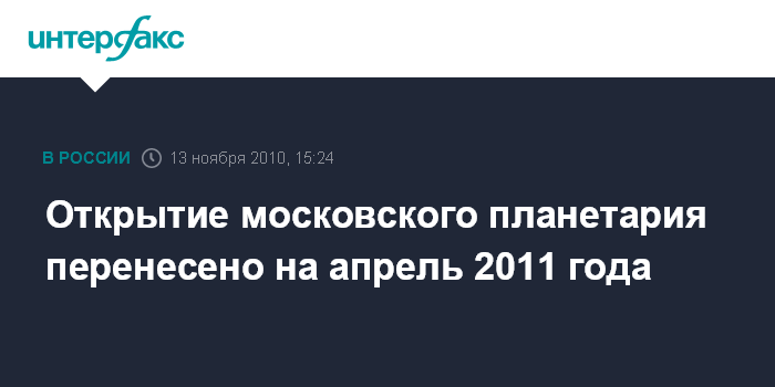 Москва. 13 ноября. INTERFAX.RU - Открытие московского Планетария состоится в День космонавтики 12 апреля 2011 года, заявил журналистам первый заммэра Москвы Владимир Ресин в ходе субботнего объезда.