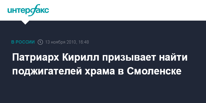 Москва. 13 ноября. INTERFAX.RU - Патриарх Московский и всея Руси Кирилл выразил сочувствие жителям Смоленска в связи с пожаром, уничтожившим на днях православный храм, и напомнил поджигателям о печальной судьбе разрушителей церквей.
