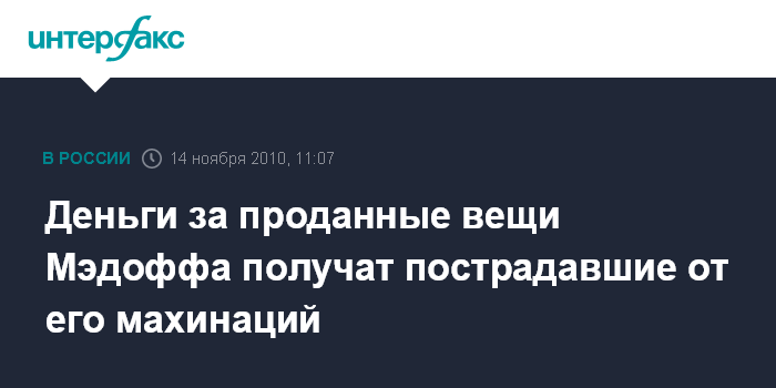 Лондон. 14 ноября. INTERFAX.RU - Личные вещи одного из самых известных аферистов Уолл-стрит Бернарда Мэдоффа проданы на аукционе в Нью-Йорке. Как отмечает в воскресенье британская телерадиовещательная корпорация Би-би-си, вся выручка пойдет на компенсацию ущерба жертвам финансовой пирамиды Б.Мэдоффа. Помимо коллекции предметов роскоши - антиквариата, часов и драгоценностей - с молотка ушли и личные вещи Б.Мэдоффа, в том числе ношеные носки и нижнее белье с его инициалами.