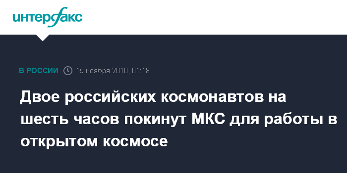 Москва. 15 ноября. ИНТЕРФАКС-АВН - Российские космонавты Федор Юрчихин и Олег Скрипочка в понедельник выйдут за пределы Международной космической станции (МКС) для проведения работ на ее поверхности.