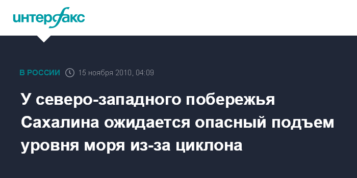 Южно-Сахалинск. 15 ноября. ИНТЕРФАКС-ДАЛЬНИЙ ВОСТОК - Во второй половине дня понедельника у северо-западного побережья Сахалина на участке Рыбновск - Москальво ожидается подъем уровня моря до отметок близким к опасным, сообщили агентству "Интерфакс-Дальний Восток" в управлении Сахалингидрометслужбы.