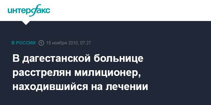 Ростов-на-Дону. 15 ноября. ИНТЕРФАКС-ЮГ - В Дагестане сотрудник милиции, находившийся с переломом руки на лечении в Хасавюртовской городской больнице, убит неизвестным в палате, сообщили агентству "Интерфакс-Юг" в городском отделе внутренних дел в понедельник.