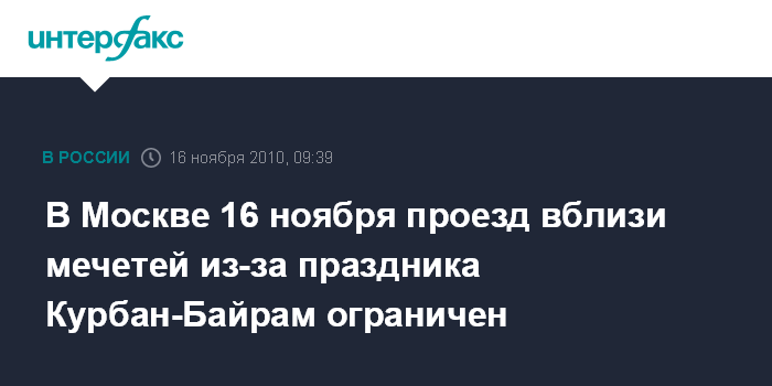 Москва. 16 ноября. INTERFAX.RU - Движение транспорта на некоторых улицах близ мечетей в центре Москвы ограничено с полуночи до полудня 16 ноября 2010 года в связи с празднованием мусульманского праздника Курбан-Байрам, сообщили "Интерфаксу" в пресс-службе Центрального административного округа столицы.