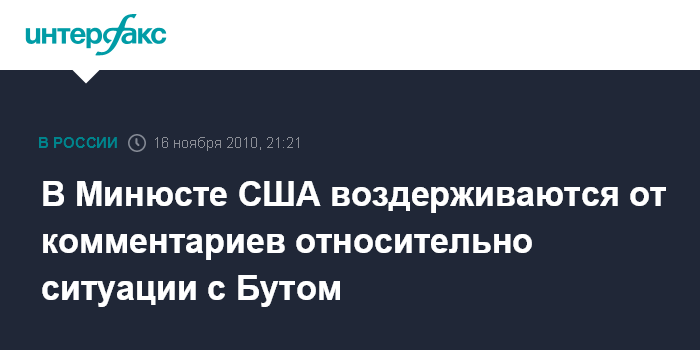 Вашингтон. 16 ноября. INTERFAX.RU - Министерство юстиции США не комментирует ситуацию вокруг российского бизнесмена Виктора Бута, сообщил во вторник "Интерфаксу" пресс-секретарь отдела национальной безопасности Минюста США Дин Бойд.