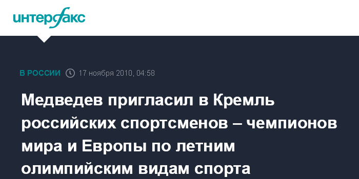 Москва. 17 ноября. ИНТЕРФАКС - Президент России Дмитрий Медведев встретится в среду в Кремле с российскими спортсменами, одержавшими в последние несколько месяцев победы на чемпионатах мира и Европы по летним олимпийским видам спорта.