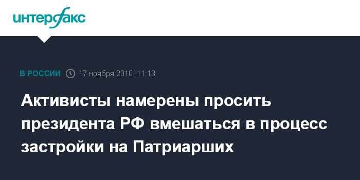 Москва. 17 ноября. INTERFAX.RU - Общественные активисты обратятся к президенту России с просьбой защитить район Патриарших прудов в Москве от разрушения и застройки.