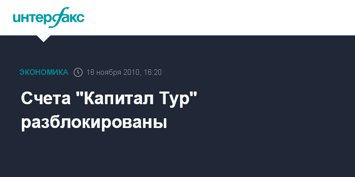 Москва. 18 ноября. INTERFAX.RU - Банки-кредиторы разблокировали счета одного из крупнейших российских туроператоров "Капитал Тур" с 15.00 МСК четверга, заявила генеральный директор компании Инна Бельтюкова.