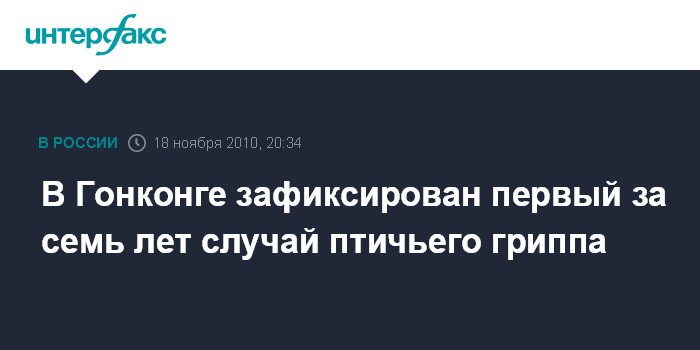 Вашингтон. 18 ноября. INTERFAX.RU - Случай птичьего гриппа у человека зафиксирован в Сянгане (Гонконге) впервые за семь лет, сообщает в четверг CNN.