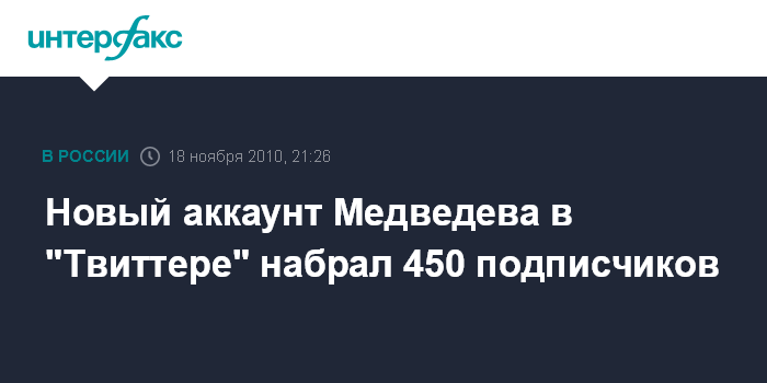 Москва. 18 ноября. INTERFAX.RU - Новый аккаунт президента России Дмитрия Медведева MedvedevRussia открылся в четверг вечером в "Твиттере".