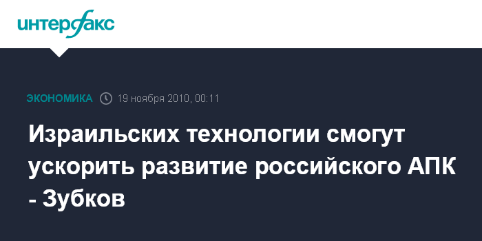 Иерусалим. 19 ноября. ИНТЕРФАКС - Первый вице-премьер РФ Виктор Зубков считает, что использование передовых израильских технологий позволит существенно ускорить развитие российского агропромышленного комплекса.