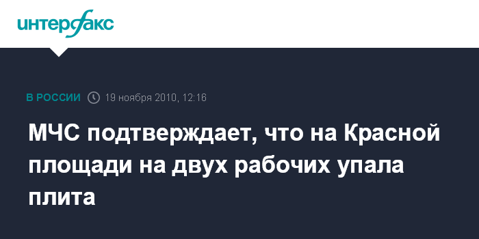 19 ноября. INTERFAX.RU - По уточненным данным, на рабочих на Красной площади в пятницу упала плита из ДСП, сообщил "Интерфаксу" начальник пресс-службы ГУ МЧС по Москве Евгений Бобылев.