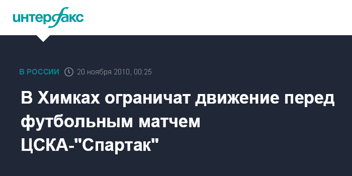 Москва. 20 ноября. ИНТЕРФАКС - В подмосковных Химках в субботу перекроют ряд улиц и усилят безопасность в преддверии матча между столичными ЦСКА и "Спартаком", сообщили ранее "Интерфаксу" в Управлении информации и общественных связей ГУВД Московской области.