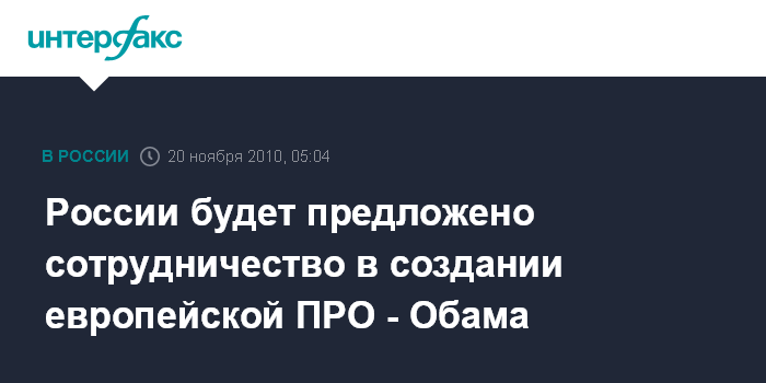 "Завтра (в субботу - ИФ) мы ожидаем начать работу с Россией о кооперации с ней в этой области (ПРО - ИФ), признавая, что у нас много общих угроз", - сказал Б.Обама в пятницу поздно вечером после дискуссии глав государств и правительств НАТО за рабочим ужином на саммите альянса в Лиссабоне.