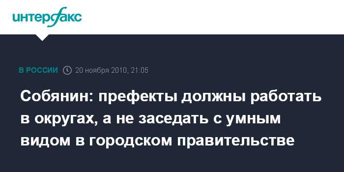 "У префектов много работы в округах, во дворах, на улицах, остановках, в школах, детских садах. Сидеть с умным видом и обсуждать (на мероприятиях правительства - ИФ) вопросы их не касающиеся, наверное, не стоит", - отметил С.Собянин в интервью программе "Вести в субботу с Сергеем Брилевым" телеканала "Россия".