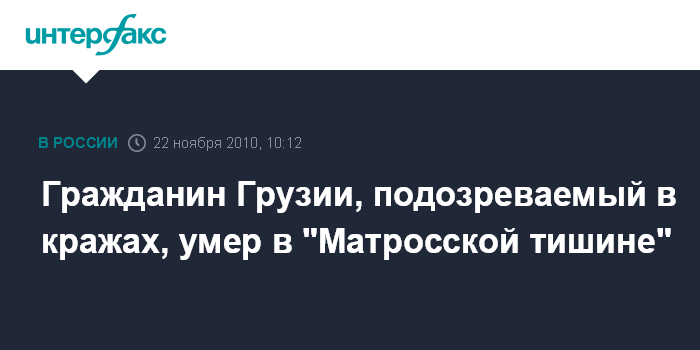 Москва. 22 ноября. INTERFAX.RU - Двадцатипятилетний гражданин Грузии, арестованный по обвинению в серии краж, совершенных в Москве, скончался в реанимации больничного корпуса следственного изолятора "Матросская тишина", сообщил в воскресенье "Интерфаксу" источник в правоохранительных органах.
