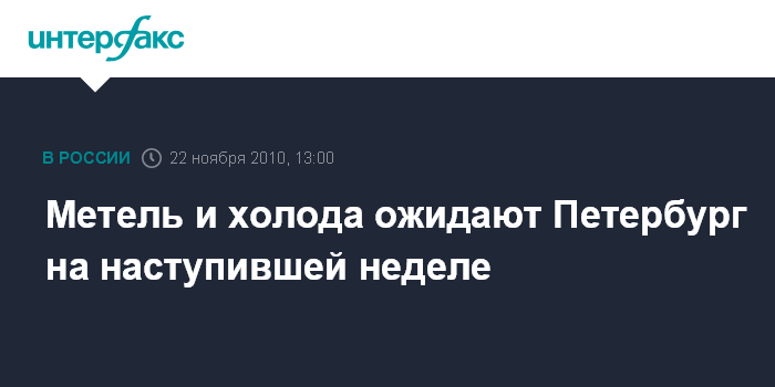 Санкт-Петербург. 22 ноября. INTERFAX.RU - Текущая неделя в Петербурге будет характерна холодной температурой и обильными снежными осадками, сообщили "Интерфаксу" в петербургском Гидрометцентре в понедельник.