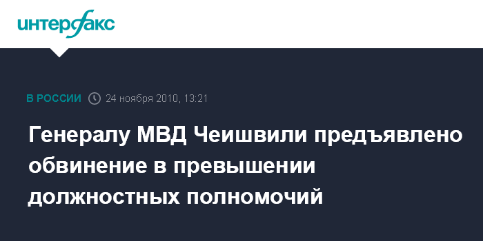 Москва. 24 ноября. INTERFAX.RU - Начальнику Центрального управления материально-технического снабжения МВД РФ генерал-майору милиции Владимиру Чеишвили предъявлено обвинение в совершении преступления, предусмотренного п. "в" ч. 3 ст. 286 УК РФ (превышение должностных полномочий), сообщил "Интерфаксу" официальный представитель СК РФ Владимир Маркин.
