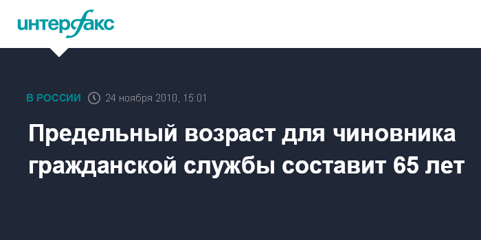 Москва. 24 ноября. INTERFAX.RU - Предельный возраст пребывания на государственной гражданской службе составит 65 лет.
