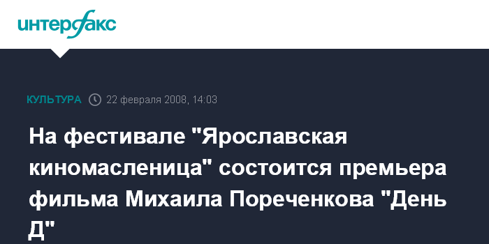 Ярославль. 22 февраля. INTERFAX.RU - На фестивале нового российского кино "Ярославская киномасленица" пройдет премьера дебютной режиссерской работы Михаила Пореченкова "День Д", сообщили "Интерфаксу" в пятницу в оргкомитете фестиваля.