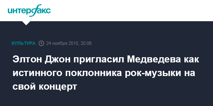 Москва. 24 ноября. INTERFAX.RU - Британский певец Элтон Джон пригласил президента России Дмитрия Медведева на свой концерт в Санкт-Петербурге, сообщает организатор мероприятия EM Concert.