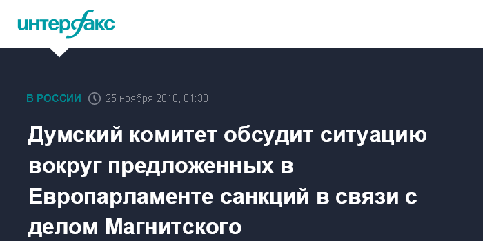 Москва. 25 ноября. ИНТЕРФАКС - Комитет Госдумы по международным делам планирует рассмотреть вопрос, связанный с рекомендациями профильного комитета Европарламента о введении санкций против российских чиновников, которые якобы причастны к смерти в СИЗО юриста Hermitage Capital Сергея Магнитского.