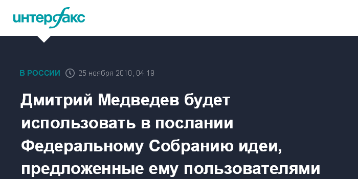 Москва. 25 ноября. ИНТЕРФАКС - Президент России Дмитрий Медведев не исключает, что в послании Федеральному Собранию будут задействованы идеи и тезисы, которыми с ним делятся пользователи Твиттера.