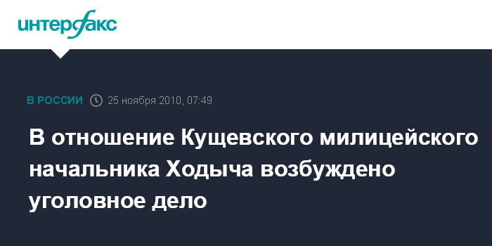Москва. 25 ноября. ИНТЕРФАКС-ЮГ - Возбуждено уголовное дело по ч.1 ст. 286 УК РФ ("превышение должностных полномочий") в отношение начальника отдела по борьбе с экстремизмом краевого ГУВД с местом дислокации в станице Кущевская Александра Ходыча, сообщили "Интерфаксу" в следственных органах региона.