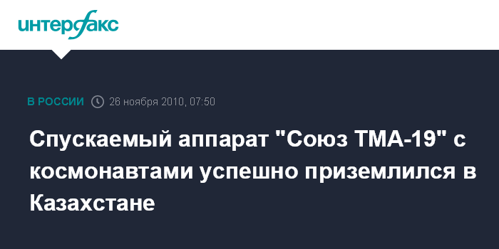 Москва. 26 ноября. ИНТЕРФАКС-АВН - Пилотируемый космический корабль "Союз ТМА-19" с российским космонавтом Федором Юрчихиным и астронавтами НАСА Дагласом Уилоком и Шенноном Уокером приземлился в Казахстане, в нескольких десятках километров от города Аркалык.