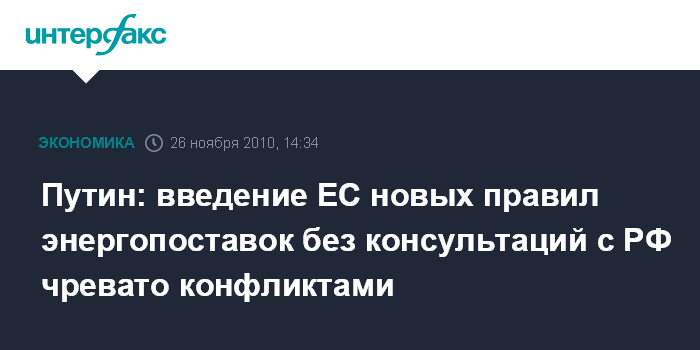 Берлин. 26 ноября. INTERFAX.RU - Премьер РФ Владимир Путин призвал Евросоюз при введении новых правил регулирования энергопоставок консультироваться с Россией, чтобы избежать ненужных недопониманий и конфликтов.