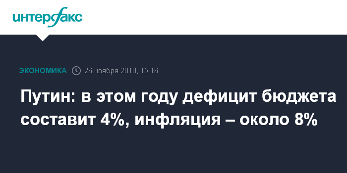 Берлин. 26 ноября. INTERFAX.RU - Премьер-министр РФ Владимир Путин заявил, что инфляция в России по итогам года составит 7 - 8%, а дефицит бюджета - около 4%.