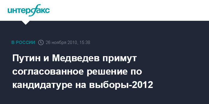 Берлин. 26 ноября. INTERFAX.Ru - Премьер-министр РФ Владимир Путин заявил, что кандидатура на президентский пост РФ в 2012 г. будет принята совместно им и действующим президентом Дмитрием Медведевым.