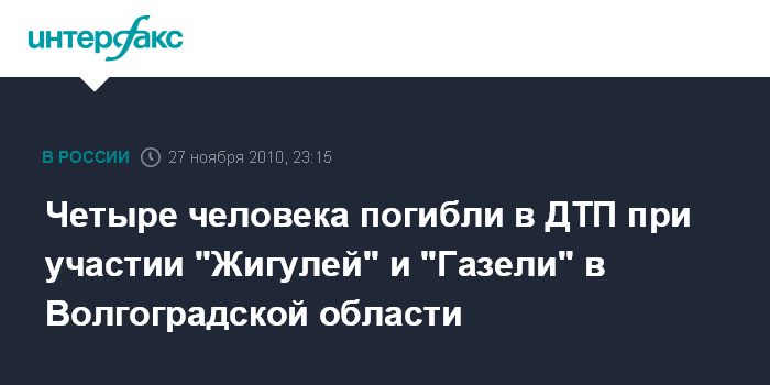 "Авария произошла на 47-м км трассы Волгоград - Котельниково в 20:45 мск. "ВАЗ-2109" столкнулся с грузопассажирской "Газелью". В результате в легковом автомобиле четыре человека погибли. Еще один пассажир "Жигулей" госпитализирован. В "Газели" никто не пострадал", - сказали в пресс-службе.