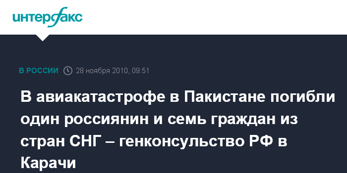 Карачи. 28 ноября. ИНТЕРФАКС - Пресс-атташе генерального консульства России в городе Карачи Алексей Зеньков подтвердил "Интерфаксу" гибель одного россиянина в катастрофе самолета в Пакистане.