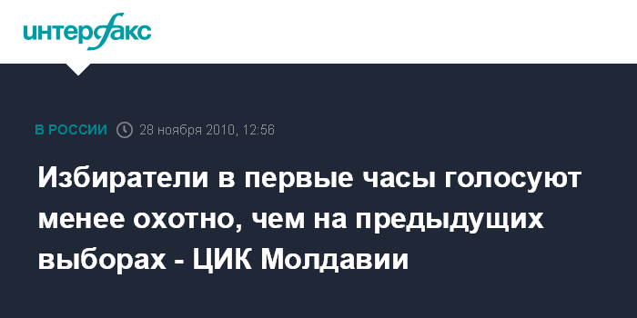 Кишинев. 28 ноября. INTERFAX.RU - Секретарь Центральной избирательной комиссии Молдавии Юрий Чокан сообщил, что за два с половиной часа в голосовании на выборах в парламент страны приняли участие 4,3 процента избирателей. Он напомнил, что для признания выборов состоявшимися необходимо участие не менее одной трети избирателей. По его словам, на выборах 5 апреля 2009 года за это же время проголосовали 6,75 процента, а 29 июля 2009 года - почти десять процентов избирателей.