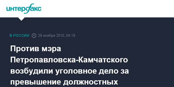 Петропавловск-Камчатский. 29 ноября. ИНТЕРФАКС-ДАЛЬНИЙ ВОСТОК - Следственным управлением Следственного комитета по Камчатскому краю против мэра Петропавловска-Камчатского Владислава Скворцова возбуждено уголовное дело по ч.2 ст. 286 УК РФ (превышение должностных полномочий).