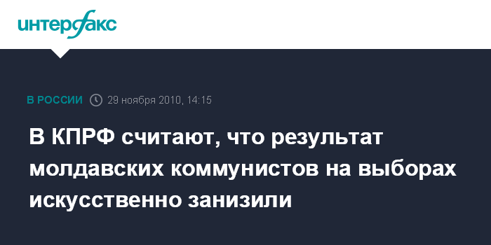 Вице-спикер Государственной думы, первый зампред ЦК КПРФ Иван Мельников в разговоре с "Интерфаксом" выразил желание "поздравить Партию коммунистов Молдавии с убедительной победой", но все же сообщил, что считает результат, полученный коммунистами, искусственно заниженным властями. "Реальная поддержка их у избирателей выше", - подчеркнул Мельников.