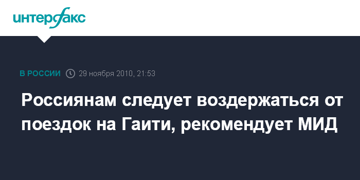 "МИД России считает целесообразным рекомендовать российским гражданам, планирующим выезд в Гаити, временно воздержаться от туристических и деловых поездок в эту страну до нормализации эпидемиологической ситуации", - говорится в сообщении, размещенном на сайте ведомства.