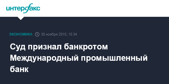 Москва. 30 ноября. INTERFAX.RU - Арбитражный суд Москвы во вторник по заявлению Банка России признал несостоятельным (банкротом) Международный промышленный банк (МПБ).