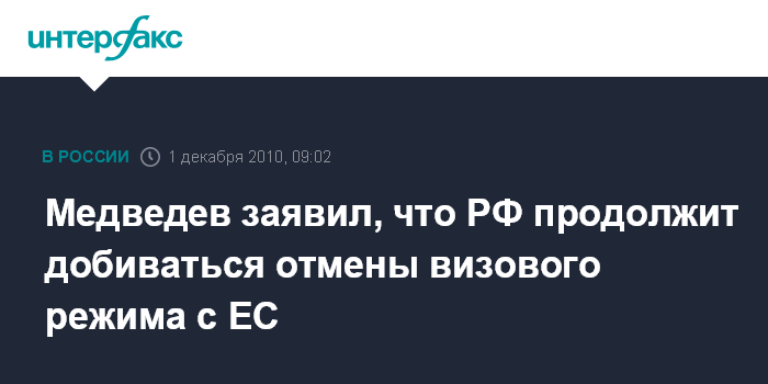 Астана. 1 декабря. INTERFAX.RU - Визовый вопрос - достаточно большая проблема в отношениях России и Евросоюза, считает президент РФ Дмитрий Медведев.