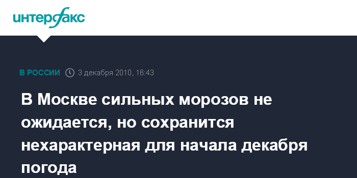 Москва. 3 декабря. INTERFAX.RU - В ближайшие выходные дни и в начале следующей недели в Москве сильных морозов не ожидается, сообщили "Интерфаксу" в Гидрометеобро Москвы и Московской области в пятницу.