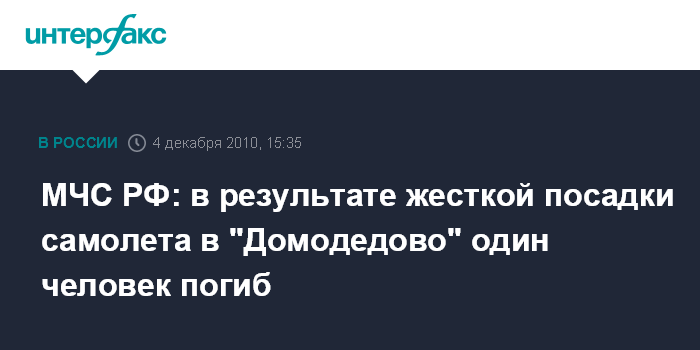 Москва. 4 декабря. INTERFAX.RU - В результате жесткой посадки самолета Ту-154 в Домодедово один человек погиб и восемь пострадали. "Самолет Ту-154, следовавший рейсом Москва - Махачкала, совершил экстренную посадку в аэропорту "Домодедово" из-за отказа всех трех двигателей", - сообщили "Интерфаксу" в управлении информации МЧС России. При посадке в аэропорту "Домодедово" самолет выкатился за пределы полосы. У самолета серьезные повреждения фюзеляжа.