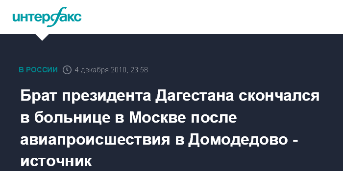 Махачкала. 4 ноября. ИНТЕРФАКС - Родной брат президента Дагестана Гаджимурад Магомедов, получивший травмы в результате авиа происшествия в Домодедово, скончался в одной из больниц Москвы, сообщил "Интерфаксу" источник, близкий к семье главы республики.