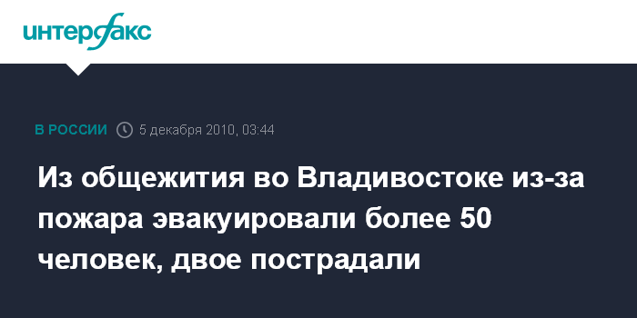 Владивосток. 5 декабря. INTERFAX.RU – В одном из девятиэтажных общежитий Владивостока в ночь на воскресенье произошел пожар, жильцы были эвакуированы, жертв нет, два человека пострадали.