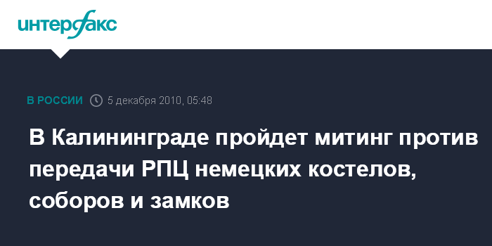 Калининград. 5 декабря. ИНТЕРФАКС СЕВЕРО-ЗАПАД - Митинг протеста против передачи Русской православной церкви (РПЦ) немецких культовых сооружений намечен на воскресенье в Калининграде.