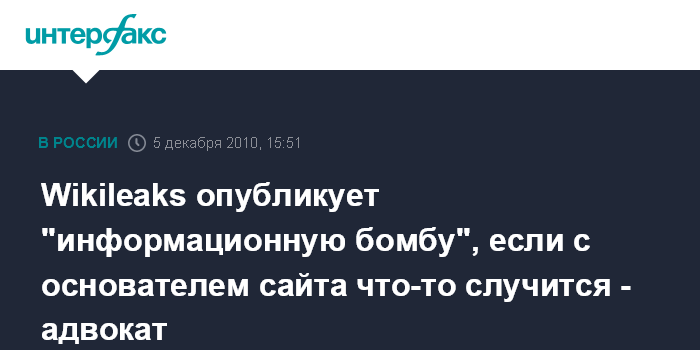 Лондон. 5 декабря. INTERFAX.RU - Британский адвокат основателя веб-сайта Wikileaks Джулиана Ассанжа заявляет, что у его клиента есть материалы, которые могут быть обнародованы в случае, если что-то случится с ним или его сайтом, сообщает британская телерадиокорпорация Би-Би-Си. Адвокат Марк Стивенс назвал это "термоядерным устройством" эры интернета. Он добавил, что дело об изнасиловании, инкриминируемом Д.Ассанжу в Швеции, - политически мотивировано. Он также опасается, что, если Д.Ассанжа депортируют в Швецию, то его в конечном итоге отправят в США.